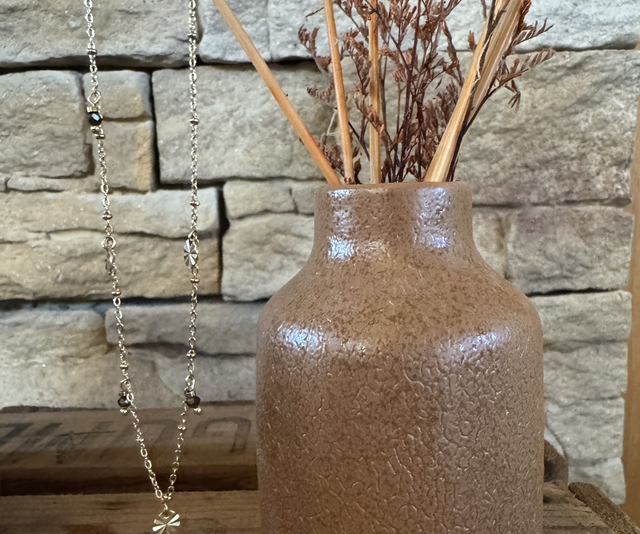 Délicat et lumineux, ce collier en acier inoxydable doré joue sur les détails avec ses petites pampilles et perles marron qui apportent de l’éclat tout en finesse. Chic et discret, il accompagne aussi bien tes looks de tous les jours que tes tenues habillées.